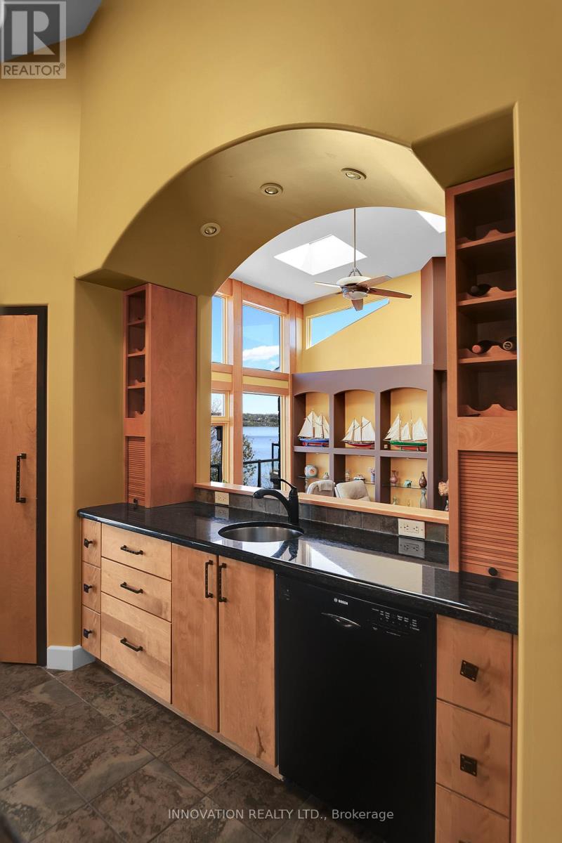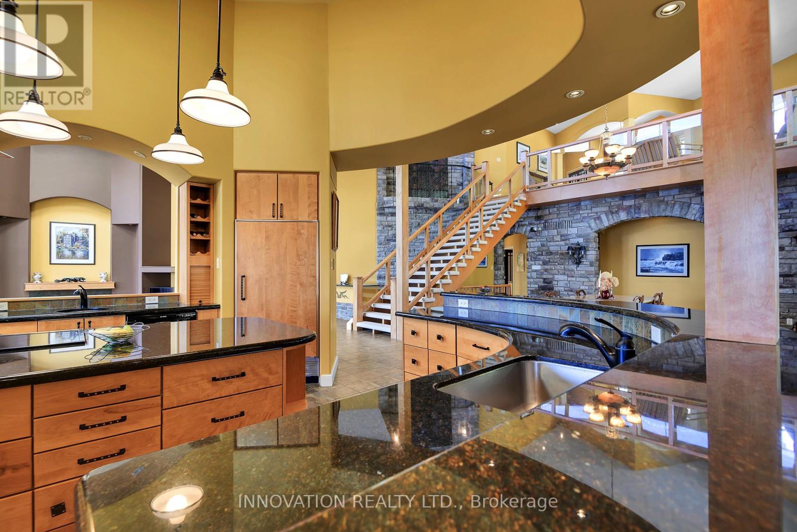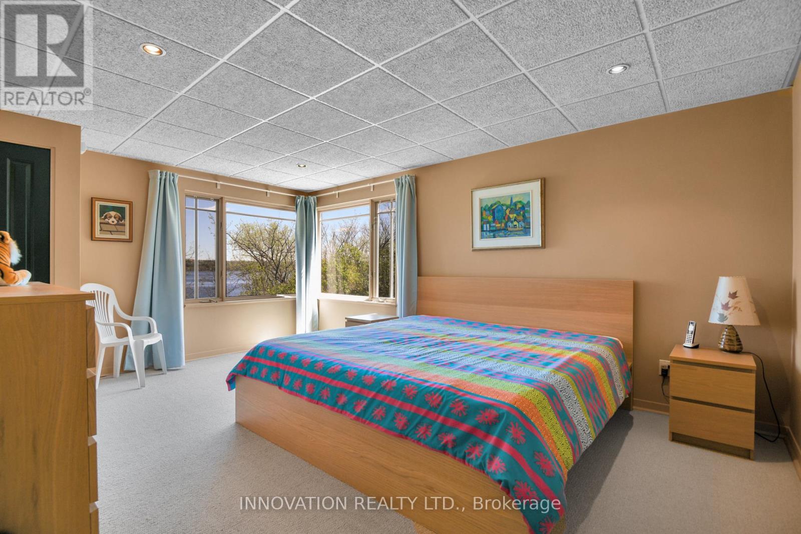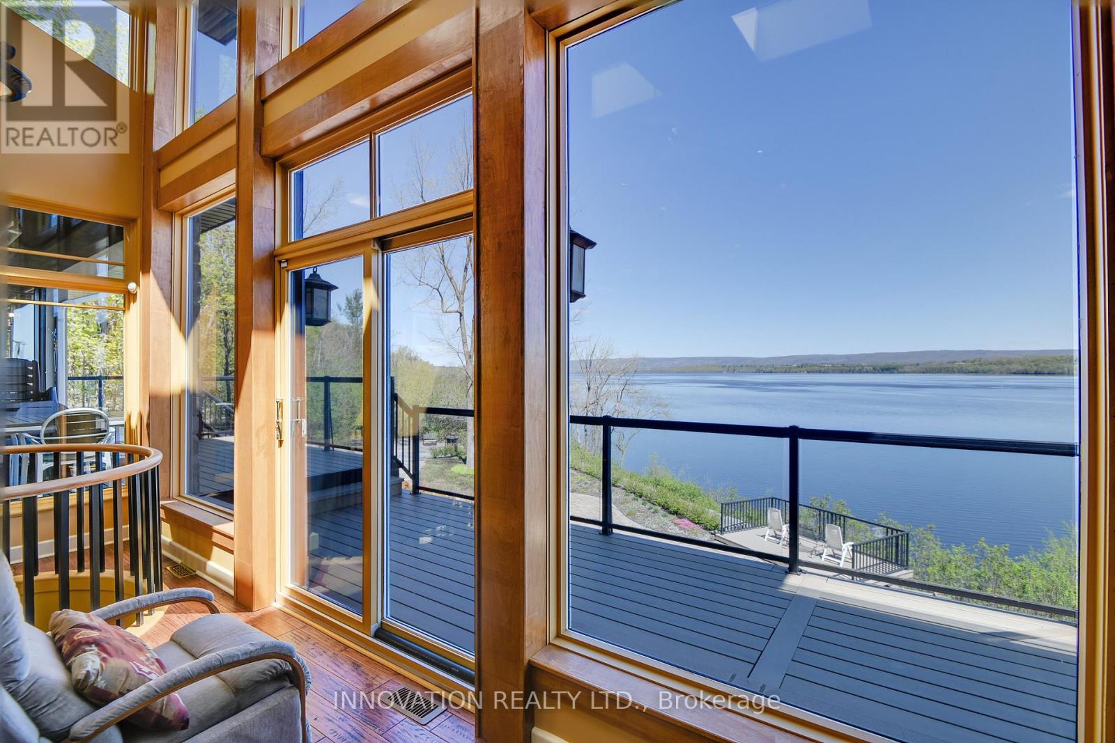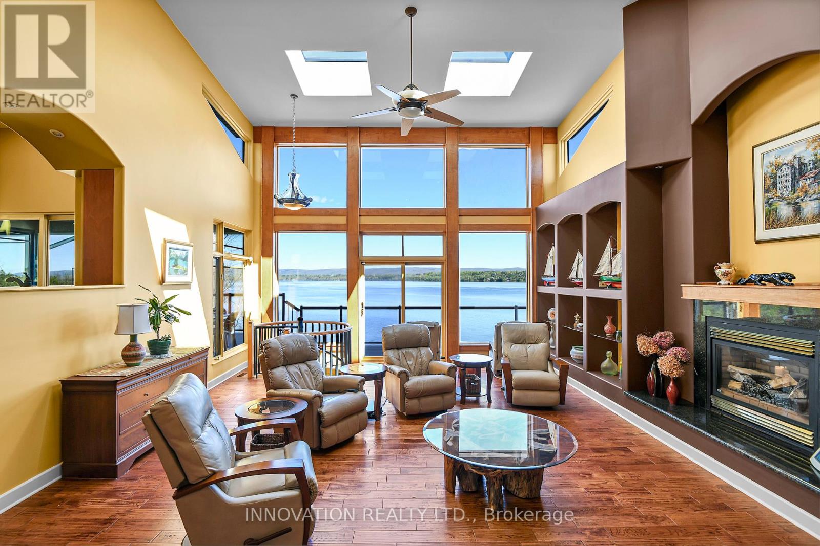 EXCEPTIONAL RIVERFRONT PROPERTY Perched safely above the Ottawa River this substantial highly customized home is designed to capture breathtaking views with private river access. Very private 1.59 acre property with 200ft riverfront. 180 degree views up & down river with fabulous city skyline vistas to the east. 4960 sqft of living space above grade plus over 2000 sqft finished space in the walkout lower level. Unassuming entry loft level opens to large open concept space as you descend the stairs giving an indication to the scale of this home. Artisan built natural stonewalls respect the rocky terrain. Customized at every corner & curve each space takes advantage of walls of windows to feature views of river & Gatineau Hills and the customized gardens all around the property. Great Rm has lofty ceilings w/skylights, fireplace, and circular staircase to the Recreation Room below. Kitchen is central to Dining & Family Rm. This well equipped Kitchen is perfect for entertaining. Very large Dining Room is accented by natural stone walls and arches. Family Room next to the Kitchen offers lovely garden views with afternoon sun & a fireplace. Spa space offers hot tub, sauna, rain shower + bathroom. Primary Bedroom suite has it all: corner windows w/views of the city skyline, deck, sunken Library, 5pc Ensuite & spacious Walk-in. 2 main level secondary Bedrooms each have Walk-ins, 3 piece Ensuites & loft spaces accessed by spiral stairs. Finished walkout lower level provides for a 2nd Family Room with a bar, Recreation Room, Media Room, 2 additional Bedrooms, a 3 piece Bathroom, and another Office. There is also a workshop, two utility rooms, and several storage areas. Extensive landscaping w/rock gardens, Trex decks, stairs to rocky shore & dock. Rare offering. 4 bay drive through garage. Generac generator for automatic transfer to the whole home if Hydro goes out. Located in Rural Kanata North along millionaires row, just minutes to many amenities. (id:2469)