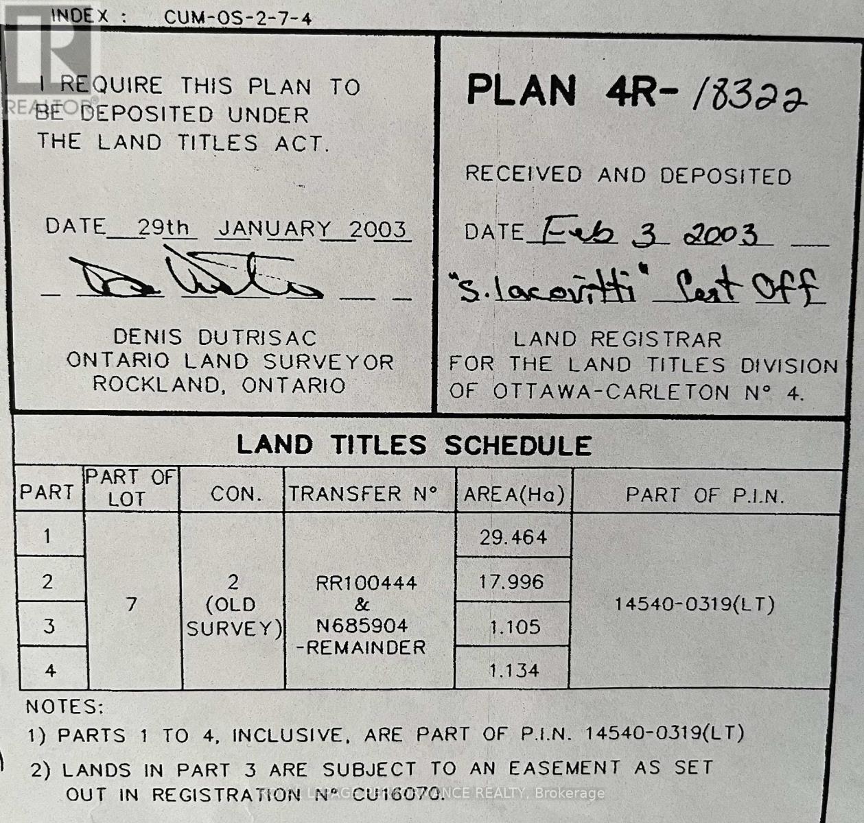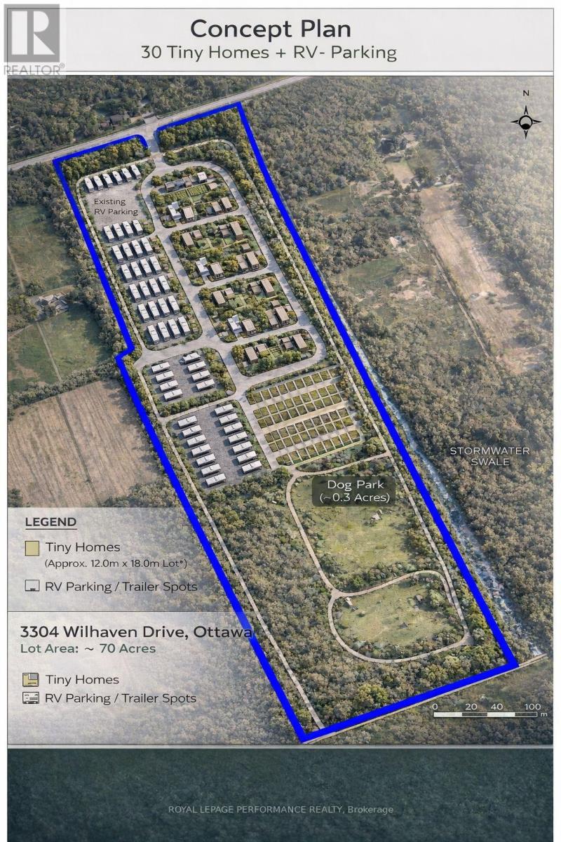 Subject property is well-located, just 16-minutes east of Place d'Orleans and 6 and minutes from the Trim Road Light Rail Station. Existing use: RV Parking with special underground "blanket" to protect parked RVs from excess humidity. Well maintained and high ceilinged Works Garage (41' x 41', 1,681 sq ft) currently available for lease at $2,500 per month plus HST plus power and heat. Parking pad for tiny home/mobile home also available for lease for $650 per month including power but excluding heat (propane). Area of subject property is 72.553 acres including arable land, uplands treed area, roadways, swimming pool (non-functional), concrete parking pad plus more than 65 RV parking places. Year-to-year farmland lease in place. Potential for tiny home community with starter homes, garden plots, workshops, storage, parking, playland, private dog park, farmgate marketing canteen, small greenhouse sales and rentals plus additional RV parking. No sign on subject property. (id:2469)