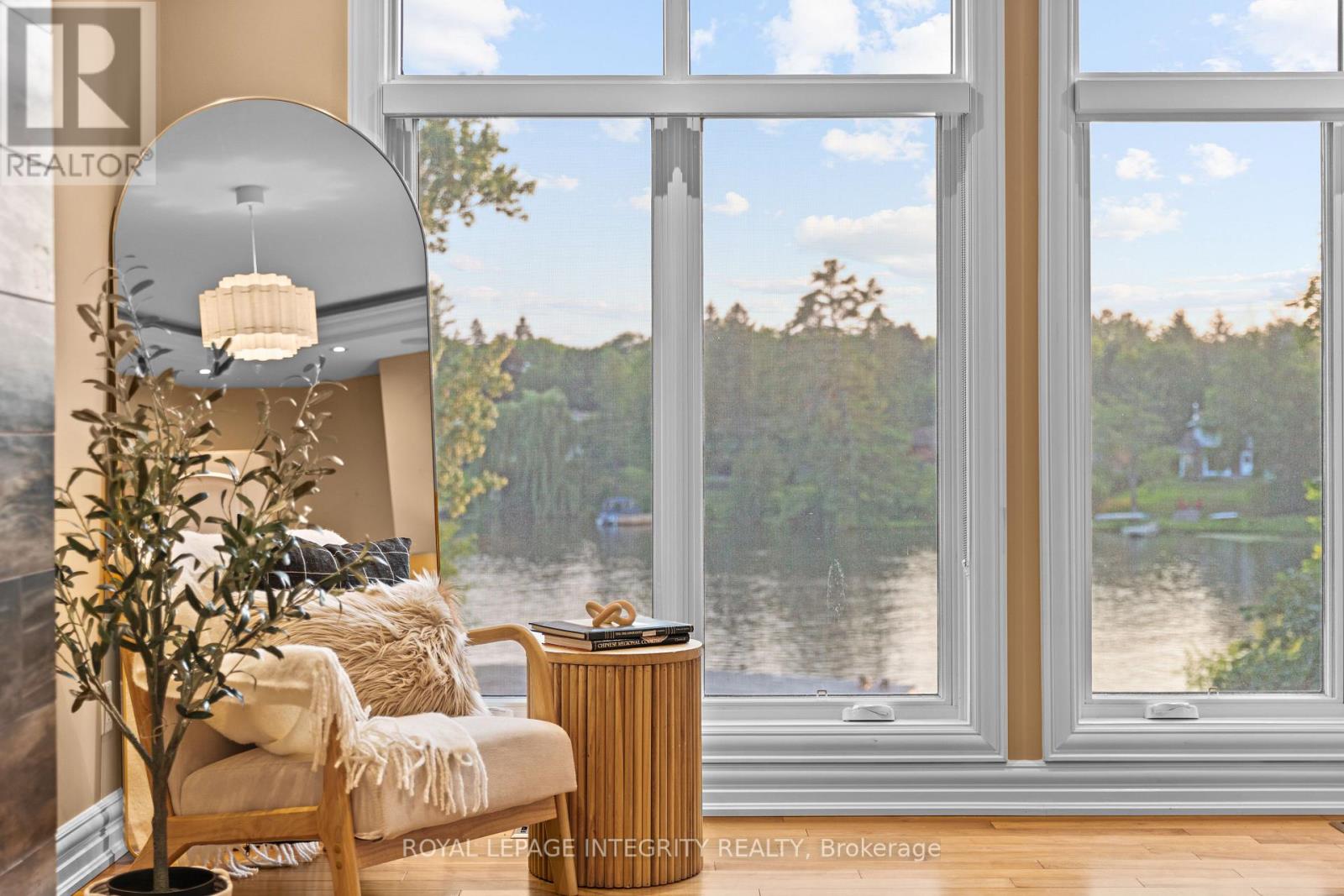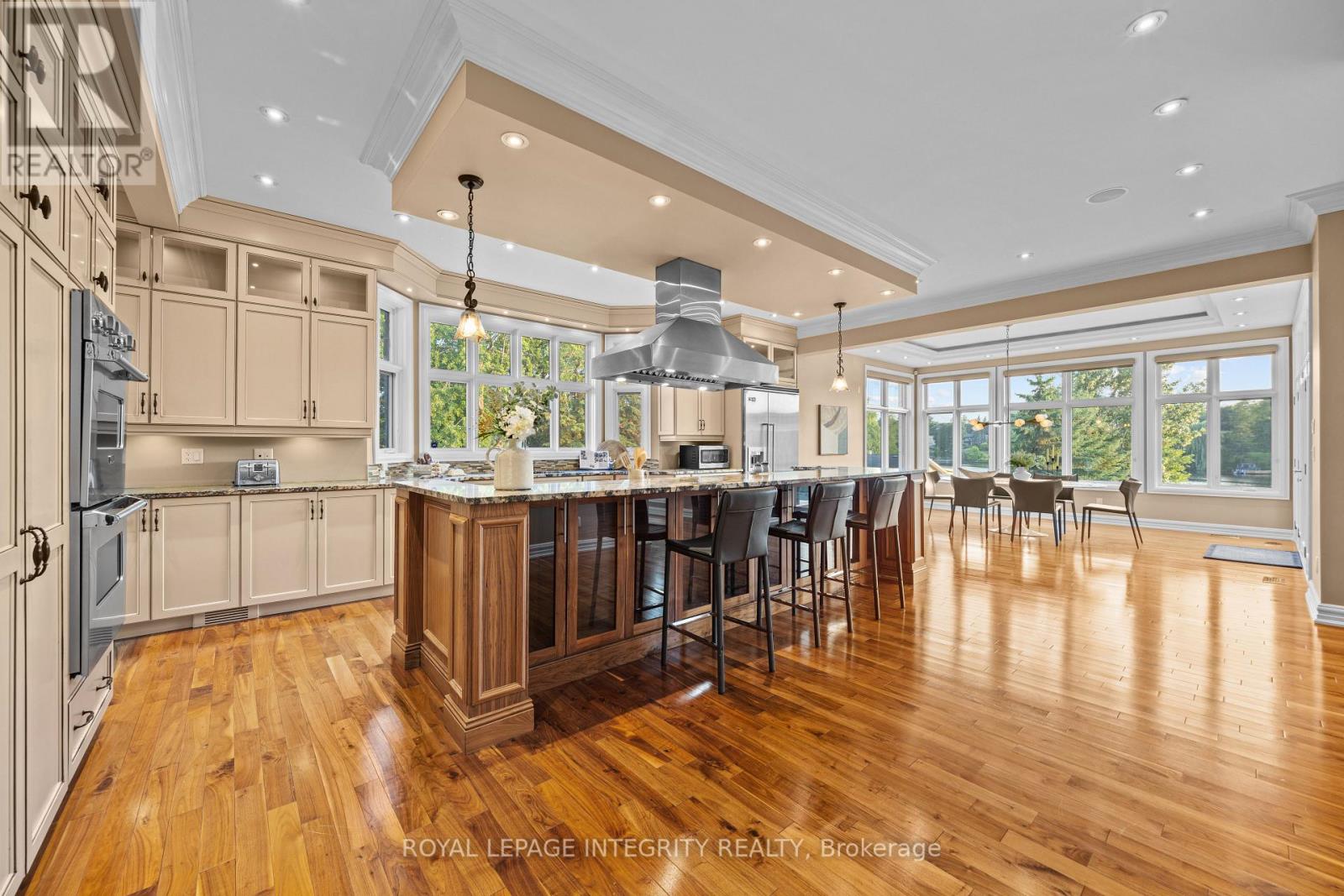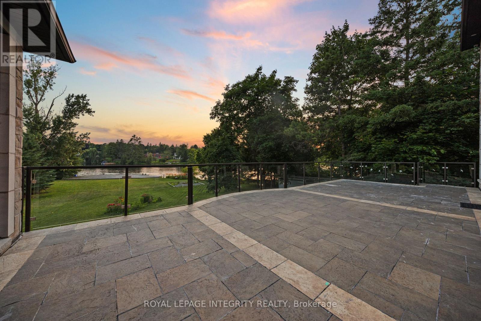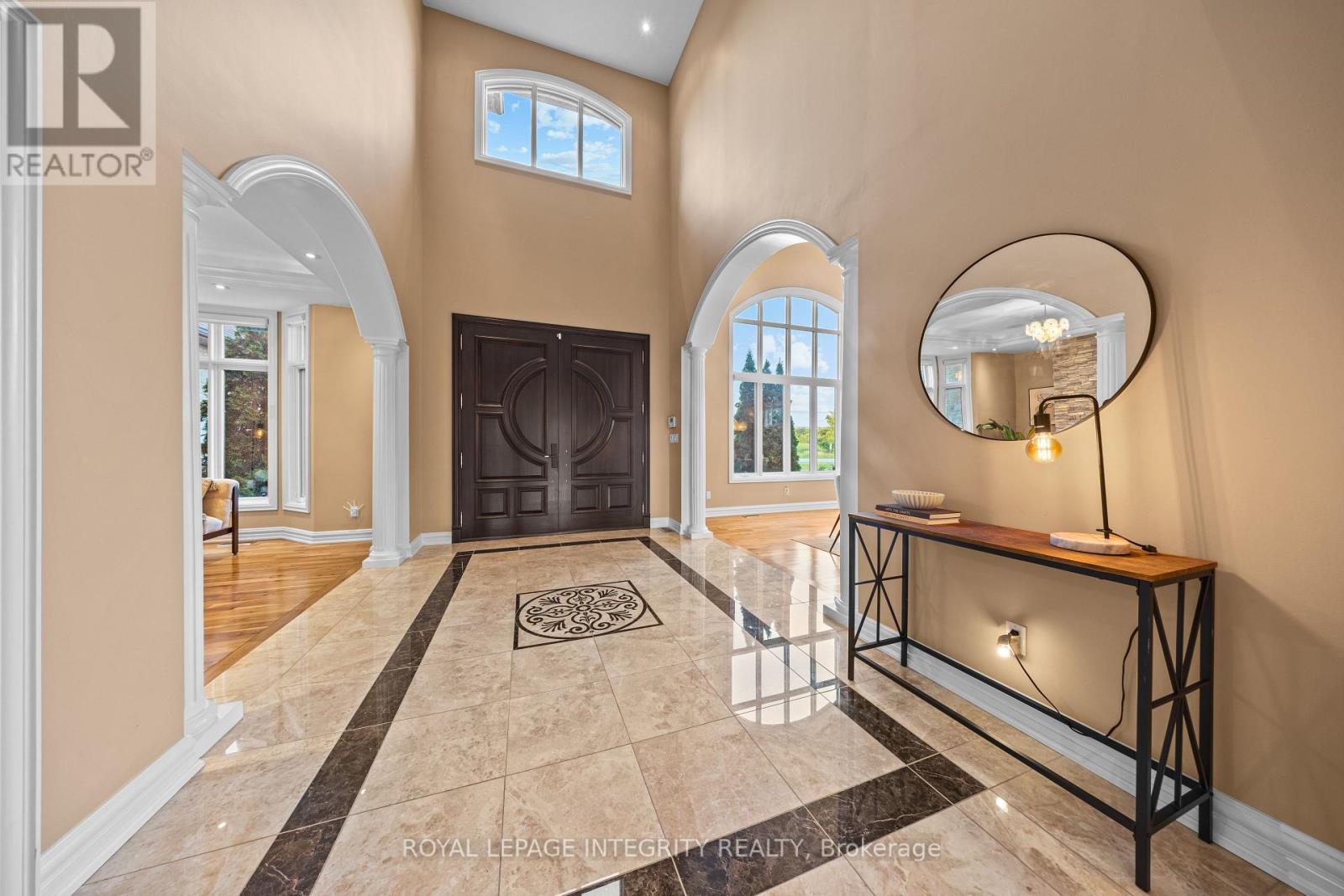 Perched along the serene Rideau River, this magnificent Italian-style villa seamlessly blends timeless elegance with modern luxury. Spanning over 7,400 sq. ft. of meticulously crafted living space, the residence delights at every turn with breathtaking river views, exquisite craftsmanship, and luxurious amenities. Beyond the dramatic 20-foot marble foyer that makes an unforgettable first impression, the home unfolds with graceful elegance. Soaring 10-foot ceilings and rich hardwood flooring flow throughout the main level, while multiple rooms showcase exquisite tray ceilings with recessed lighting, creating an ambiance of refined warmth. The formal dining room impresses with its 14-foot arched ceiling and stunning arched window that fills the space with natural light while framing picturesque outdoor views. The gourmet kitchen features a 13-foot granite island, top-tier Viking appliances, and custom walnut and Pashmina White cabinetry, complemented by a walk-in pantry for effortless entertaining. The adjoining breakfast area and family room bathe in natural light and offer panoramic water views, enhanced by a convenient wet bar and rough-in elevator. The main floor also includes a spacious executive office with private balcony access, along with a full bathroom that doubles as a guest suite. Upstairs, four bedroom suites each boast generous walk-in closets and spa-like Ensuite offers a massage shower & granite counter tops. The walkout basement serves as a versatile retreat, featuring high ceilings, oversized windows, a fifth bedroom, and a full bath. Enjoy whole-home indoor & outdoor audio system. Outside, the home's full stone façade exudes sophistication, while the expansive 650 sq. ft. balcony and private dock invite you to enjoy the breathtaking riverfront setting. Every detail of this exceptional residence has been thoughtfully designed to deliver an extraordinary living experience. (id:2469)